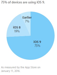 Apple a făcut publice pe 11 ianuarie noile cifre privind rata de adopție a noului sistem de operare lansat oficial odată cu iPhone 6S. Au ajuns la 75%, iar terminalele pe care este instalat iOS 8 reprezintă 19%. Restul produselor Apple cu iOS instalat au versiuni anterioare, în mare parte iOS 7.