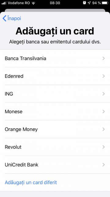 Te duci în Wallet, și apeși semnul plus. Apoi vei alege o bancă din listă sau pur și simplu scanezi un card de-al tău din portofel. Unele servicii cum se observă la Revolut au un buton de adăugare direct în aplicație.