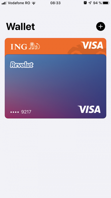 Cardul vizibil în totalitate în Wallet este cel cu care vei plăti și poți să le reordonezi pentru a alege cardul cu care vei plăti. Deci în imaginea de mai sus cardul Revolut este cel cu care voi plăti la apropierea telefonului.