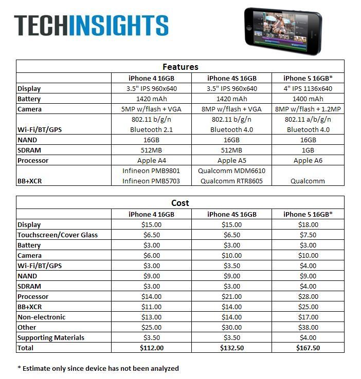 Conform specialistilor de la Techinsights estimarea pretului de productie este destul de fidela. Daca ne uitam ca versiunile precedente au avut preturi mai mici: 112$ pentru iPhone 4 si 132$ pentru iPhone 4S ar insemna ca Apple castiga anul acesta mai putin per unitate, insa nu trebuie sa uitam ca iPhone 5 da semne ca se vinde mai bine ca orice model de pana acum.