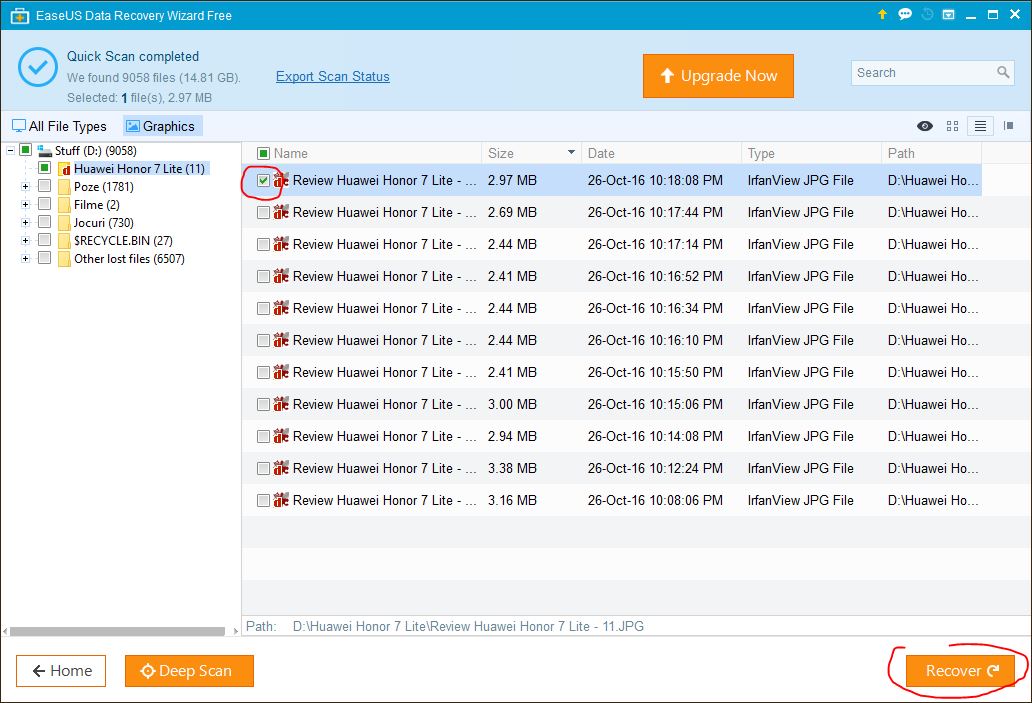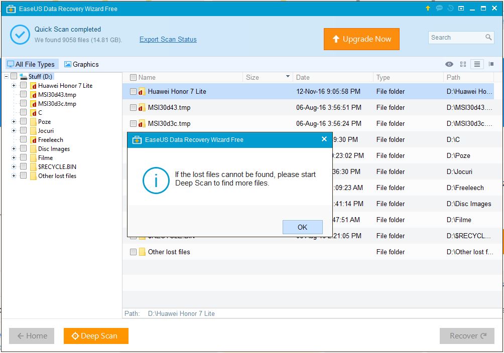 Am continuat spre scanare și am obținut rezultatele din imaginea de mai sus. Acolo îți sunt marcate folderele cu un „d” roșu cele care au fost șterse. Trebuie să navighezi prin folderele indexate de către aplicație. Dacă nu găsești documentul dorit, așa cum te anunță mai sus după scanarea rapidă vei putea face și o scanare amănunțită „Deep Scan” cum este denumită în program. Trebuie doar apăsat butonul pentru a face o scanare amănunțită, nimic mai mult.