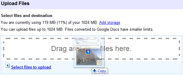 Google Docs poate primi fisierele pentru upload prin drag and drop, optiune deja valabila in Gmail, daca sunteti familiarizati. Principalul avantaj este acela ca nu necesita nici un plug-in instalat pentru a functiona ( de genul adobe flash).
