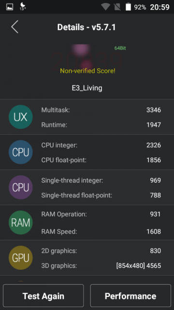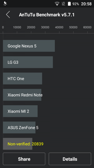 Punctajul obținut în AnTuTu este de 20839, care-l așează într-un loc onorabil zic eu lângă ASUS ZenFone 5. Sper să fie scorul real pentru că zicea non-verified dintr-un oarecare motiv. Utilizarea în realitate se făcea de regulă fluent însă în anumite momente în care erau deschise mai multe aplicații și vroiai să execuți rapid niște comenzi, nu prea făcea față. Adică am folosit hărți offline Here Maps, Google Maps și Booking frecvent la Paris și mă descurcam destul de greu cu ele din cauză probabil că trebuia să tot schimbe datele din memoria RAM în funcție de ce aplicație doream să folosesc.