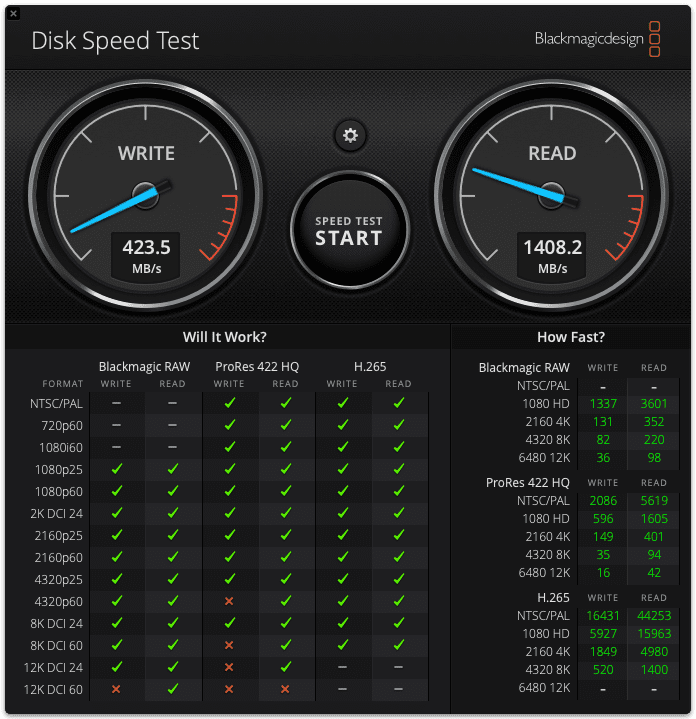 Mai jos poți vedea captura din Disk Speed Test de la Blackmagic. Și cel mai mult am prins 600 MB/s la scriere și 1600 MB/s la citire de pe harddisk-uri. Vitezele sunt suficiente pentru editare video pentru cele mai multe cazuri atât timp cât nu editezi material video RAW de rezoluție peste 6K+, iar dacă optimizezi cât se poate de mult procesul atunci vei genera oricum fișiere proxy stocate local. Dar dacă vrei poți lucra direct de pe NAS fără să recomprimi fișierele video, mai ales dacă îți faci un flux prin care utilizezi memoria cache M2.