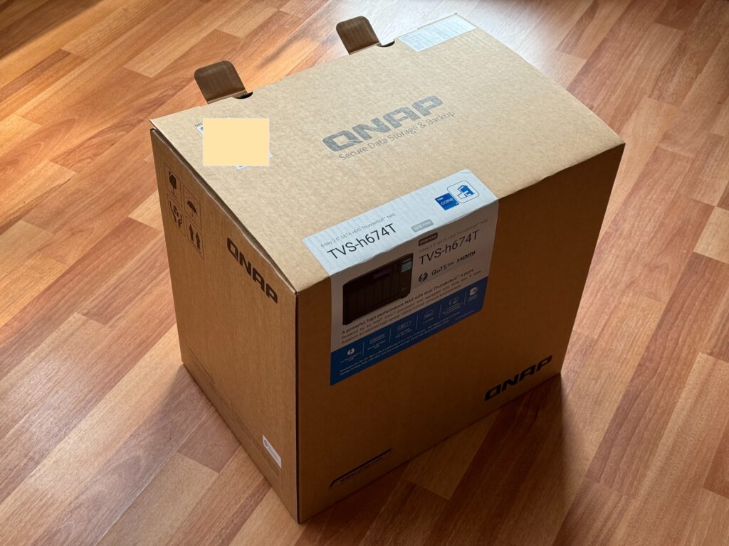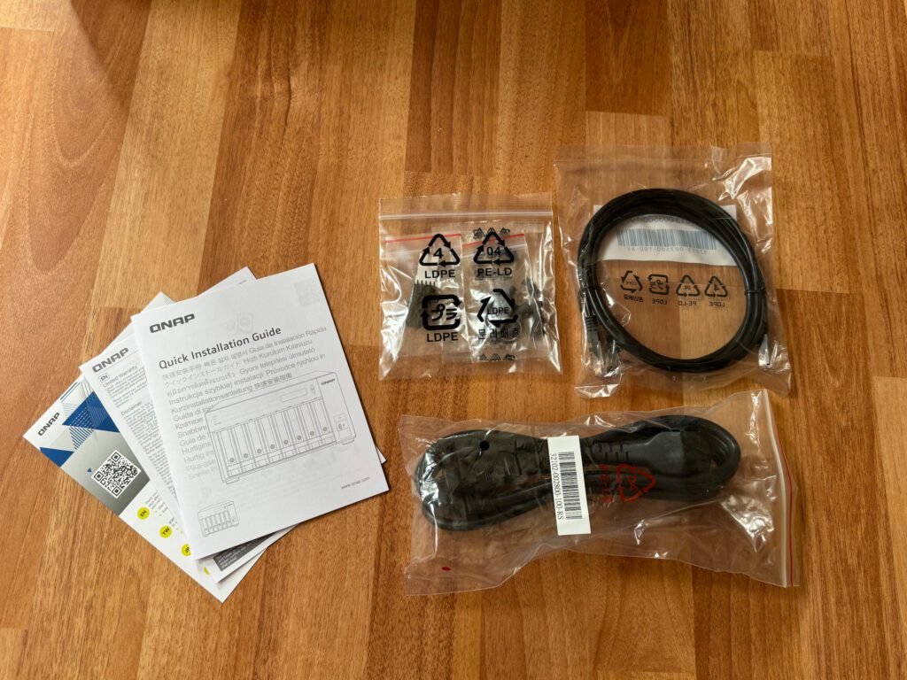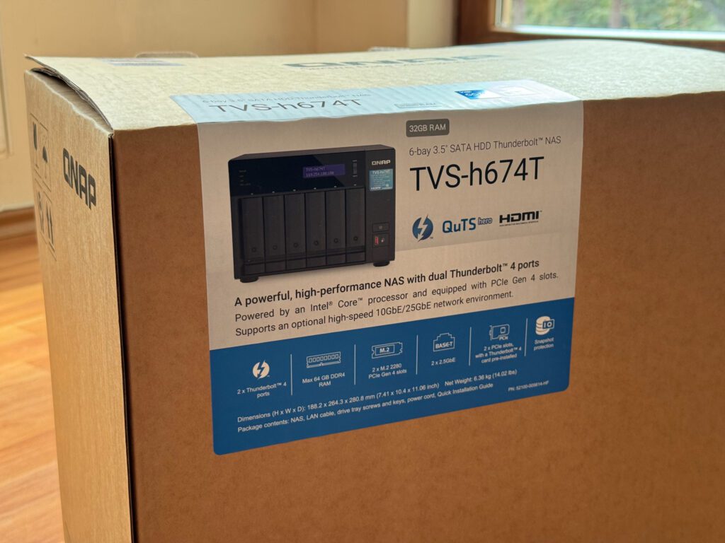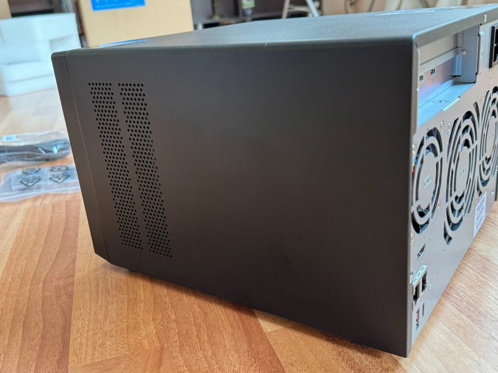 Livrarea NAS-ului se face în două cutii, iar în interior este protejat de bureți groși care pot amortiza șocuri puternice. În interior pe lângă aparat se mai află un cablu LAN care suportă o conexiune 2.5 Gbps, un cablu de alimentare la curent, 32x șuruburi pentru prindere harddisk-uri de 3.5″ în suport și 24x șuruburi pentru cele de 2.5″, dar se pot instala fără șuruburi cu niște clips-uri de plastic, și 2x radiatoare pentru memorii de stocare M2.