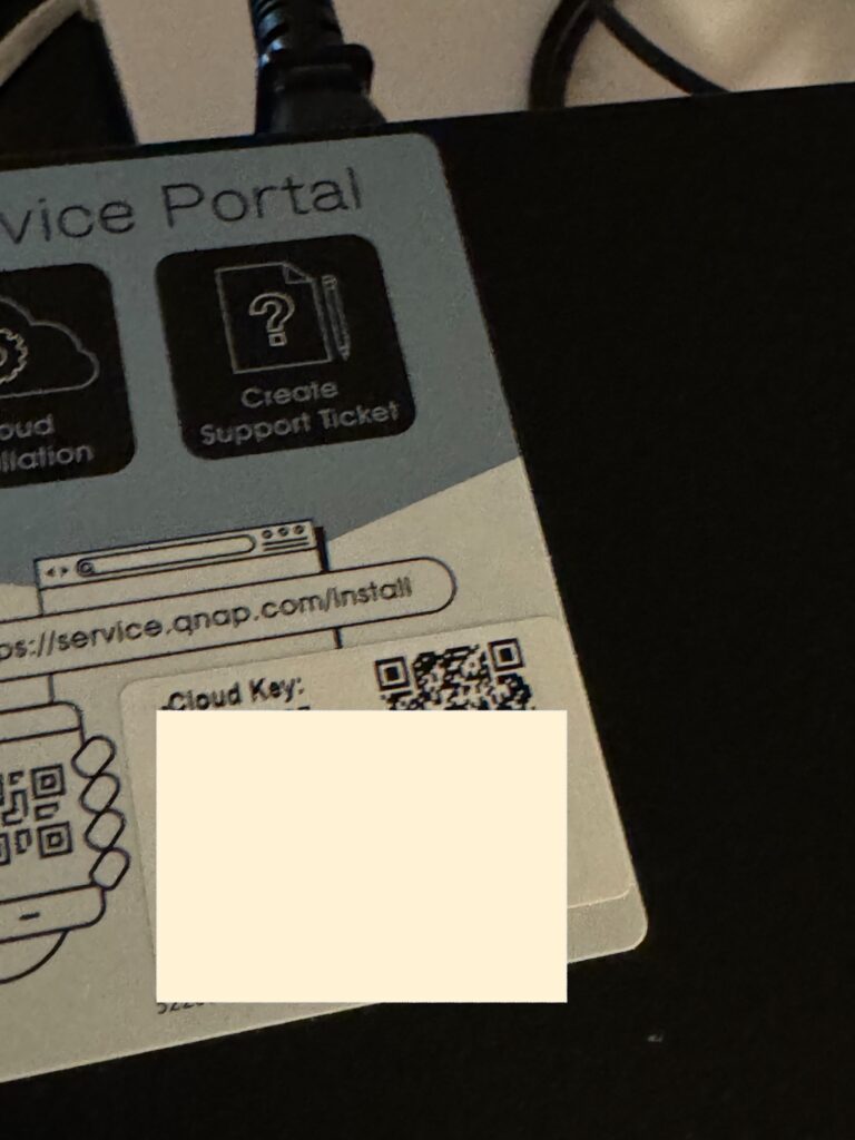 Pentru a configura NAS-ul m-am uitat puțin în ghid apoi am vazut o etichetă sugestivă lipită de carcasă. Sugera că pentru accesare să scanez codul QR și așa am făcut. A trebuit doar să fie NAS-ul conectat la router astfel încât să aibă acces Internet, apoi în serviciul web de la QNAP acesta a fost identificat și am început crearea unui cont și procesul de configurare care nu a fost deloc greu. Am ascuns MAC-ul în imagine și alte informații sensibile.