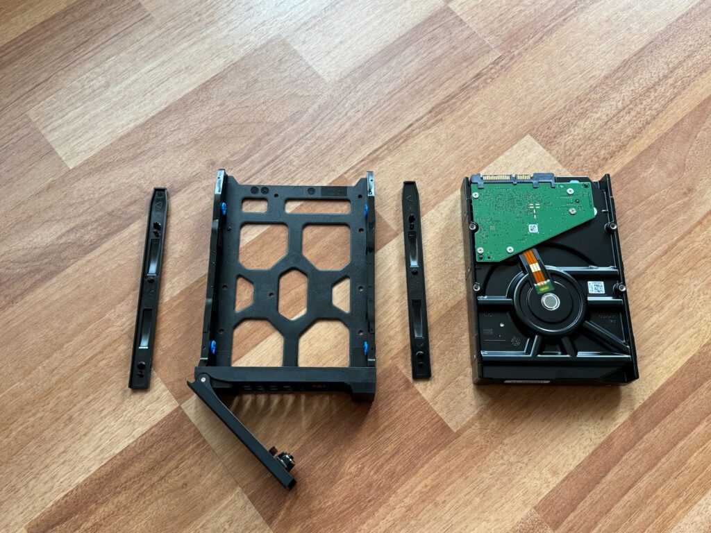 Instalarea fizică a HDD-urilor este mai simplă decât anticipam. Suportul din plastic care este ca un sertar, se deblochează din NAS trăgând de clapetă în sus apoi îl poți scoate din carcasă. Conform ghidului printat rapid, se vor scoate două plastice de pe lateralele suportului, se așează harddisk-ul ca în imaginile de mai sus cu circuitele în jos, apoi se prind înapoi de suport având grijă să fie aliniați pinii de prindere cu găurile harddisk-ului.