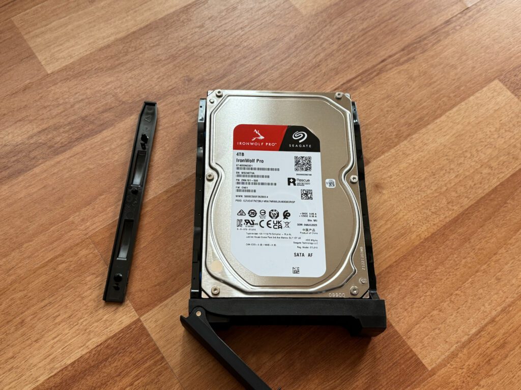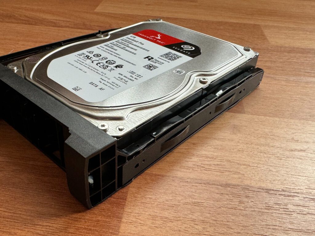 Ce stocare am folosit in teste? În configurația testată de mine am folosit 3 HDD-uri Seagate IronWolf Pro NAS 4TB, 7200rpm, 256MB cache, dedicate sistemelor NAS care sunt optimizate a rula constant 24/7 și sunt mai rezistente la vibrații comparativ cu serii mai ieftine care sunt utilizate pe desktop-uri. Le-am setat în modul RAID 5, astfel că datele sunt împărțite pe cele 3 HDD-uri și oferă redundanță. În cazul în care se defectează unul dintre harddisk-uri, voi putea să-l înlocuiesc pur și simplu chiar în timp ce este pornit, pentru că acest NAS suportă hotswap, și datele vor fi recuperate din celelalte 2.