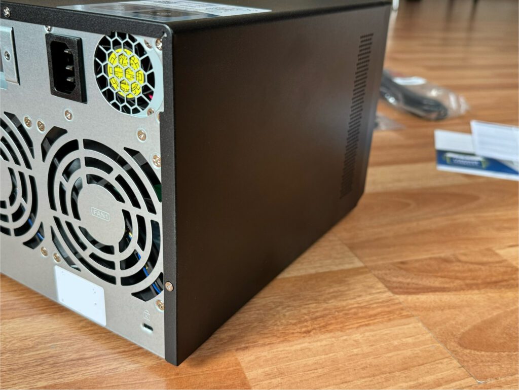 În față vei vedea cele 6 bay-uri în care vei introduce harddisk-uri de 3.5″ sau de 2.5″ în funcție de buget și nevoile de stocare. Vei vedea puțin mai departe cum. Bay-urile pot fi blocate în slot cu o cheiță livrată în pachet. În partea de sus vei putea vedea sub forma unor lumini LED statusul conexiunilor LAN, Internet, HDD-urile și memoriile M2. Harddisk-urile și ele vor avea led-uri verzi fiecare deasupra unui bay. Atunci când hardisk-urile citesc / scriu date led-urile vor clipi.