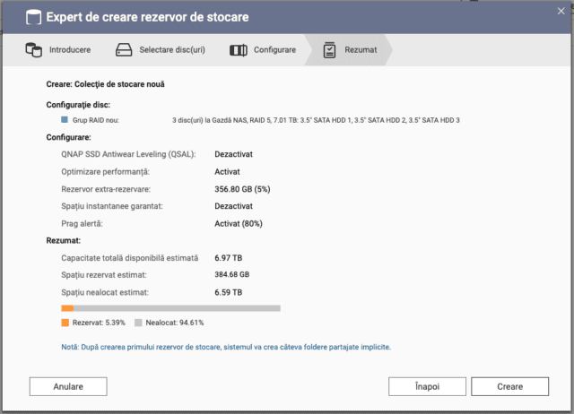 Eu am obținut din capacitatea totală de 12 GB a harddisk-urilor cam 7 GB după ce am ales sistemul RAID 5 care mănâncă o parte din spațiu pentru redundanță, apoi necesarul de spațiu rezervat pentru alte lucruri ce țin de eficiența sistemului.