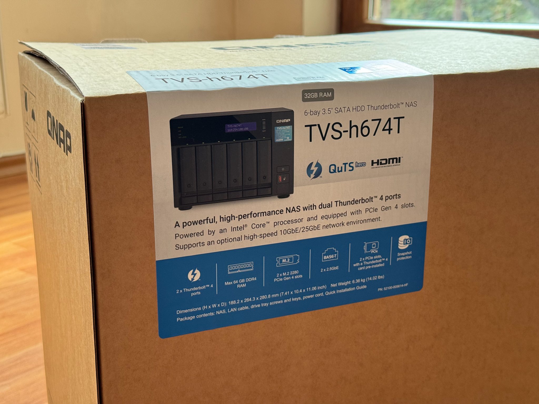 Livrarea NAS-ului se face în două cutii, iar în interior este protejat de bureți groși care pot amortiza șocuri puternice. În interior pe lângă aparat se mai află un cablu LAN care suportă o conexiune 2.5 Gbps, un cablu de alimentare la curent, 32x șuruburi pentru prindere harddisk-uri de 3.5″ în suport și 24x șuruburi pentru cele de 2.5″, dar se pot instala fără șuruburi cu niște clips-uri de plastic, și 2x radiatoare pentru memorii de stocare M2.