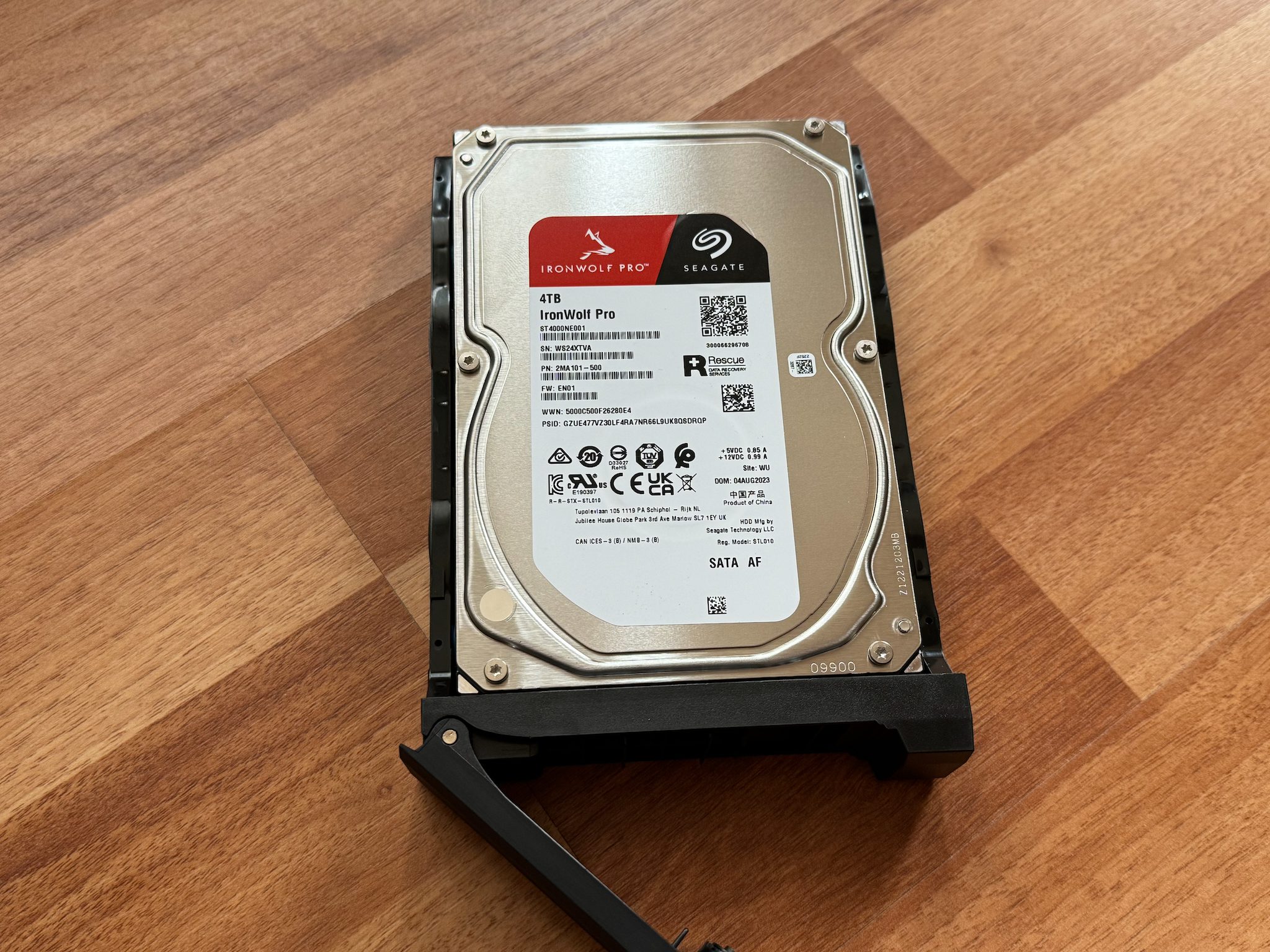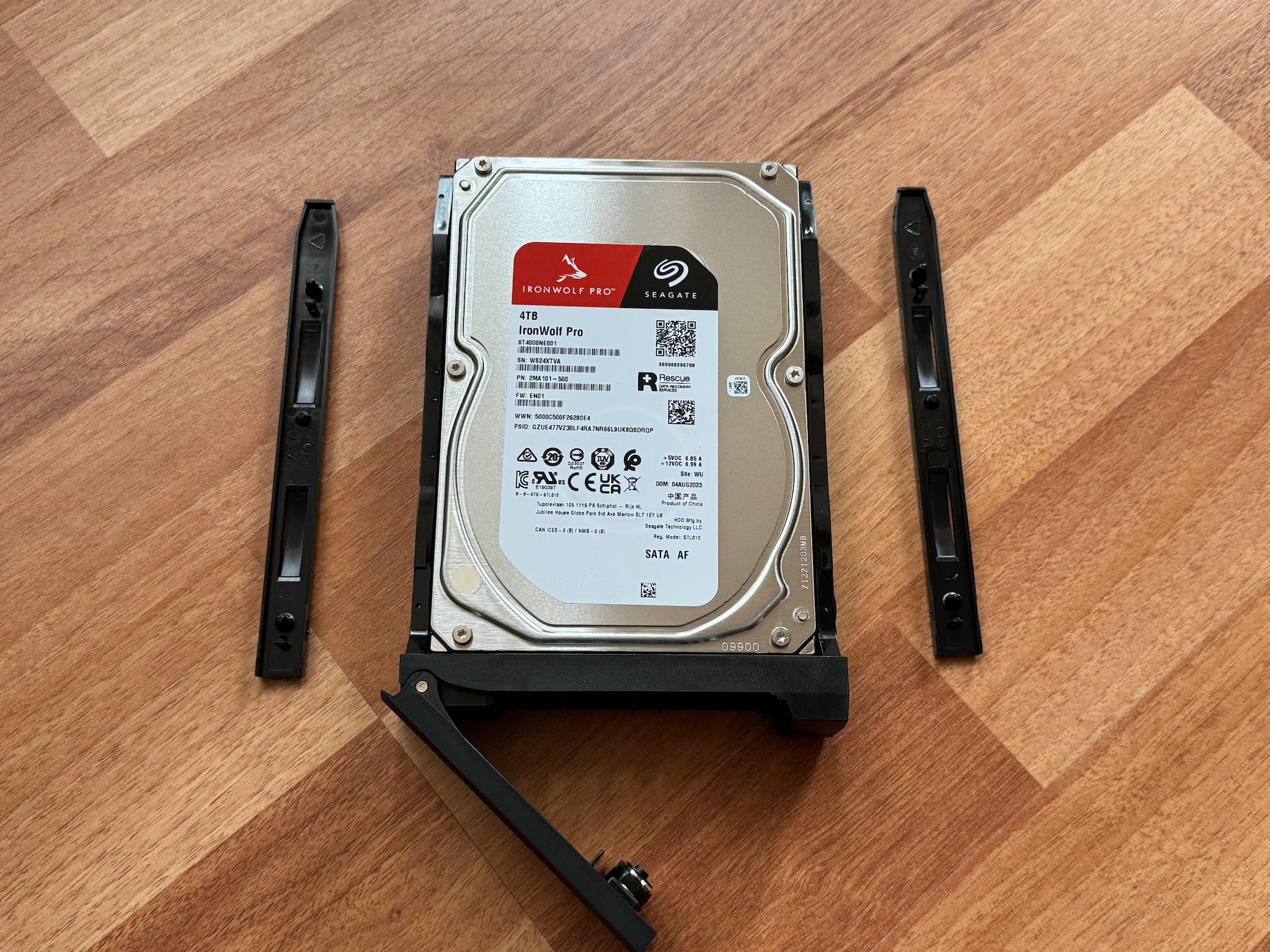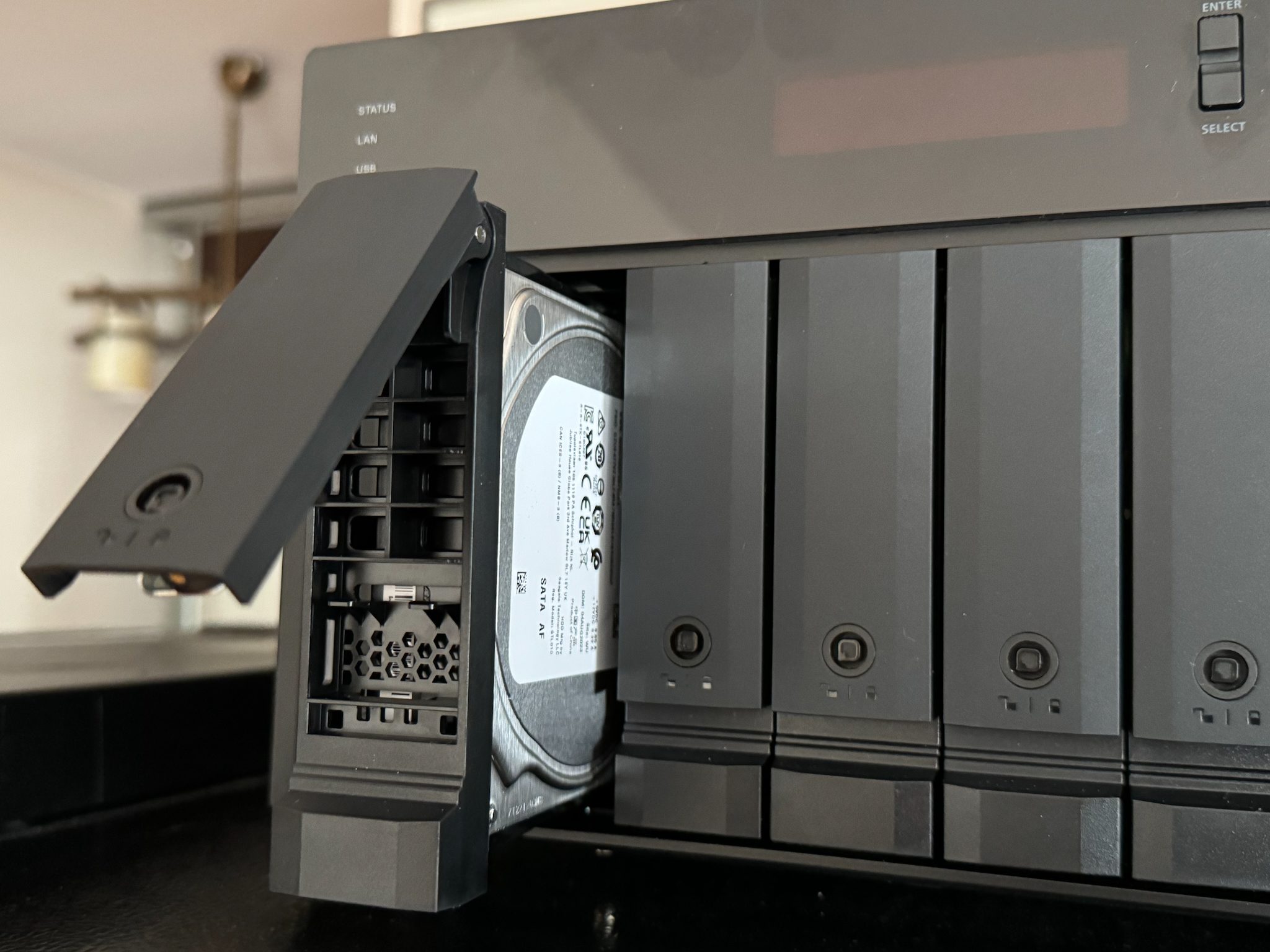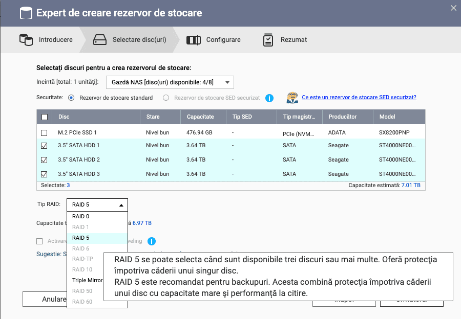 Ce stocare am folosit in teste? În configurația testată de mine am folosit 3 HDD-uri Seagate IronWolf Pro NAS 4TB, 7200rpm, 256MB cache, dedicate sistemelor NAS care sunt optimizate a rula constant 24/7 și sunt mai rezistente la vibrații comparativ cu serii mai ieftine care sunt utilizate pe desktop-uri. Le-am setat în modul RAID 5, astfel că datele sunt împărțite pe cele 3 HDD-uri și oferă redundanță. În cazul în care se defectează unul dintre harddisk-uri, voi putea să-l înlocuiesc pur și simplu chiar în timp ce este pornit, pentru că acest NAS suportă hotswap, și datele vor fi recuperate din celelalte 2.