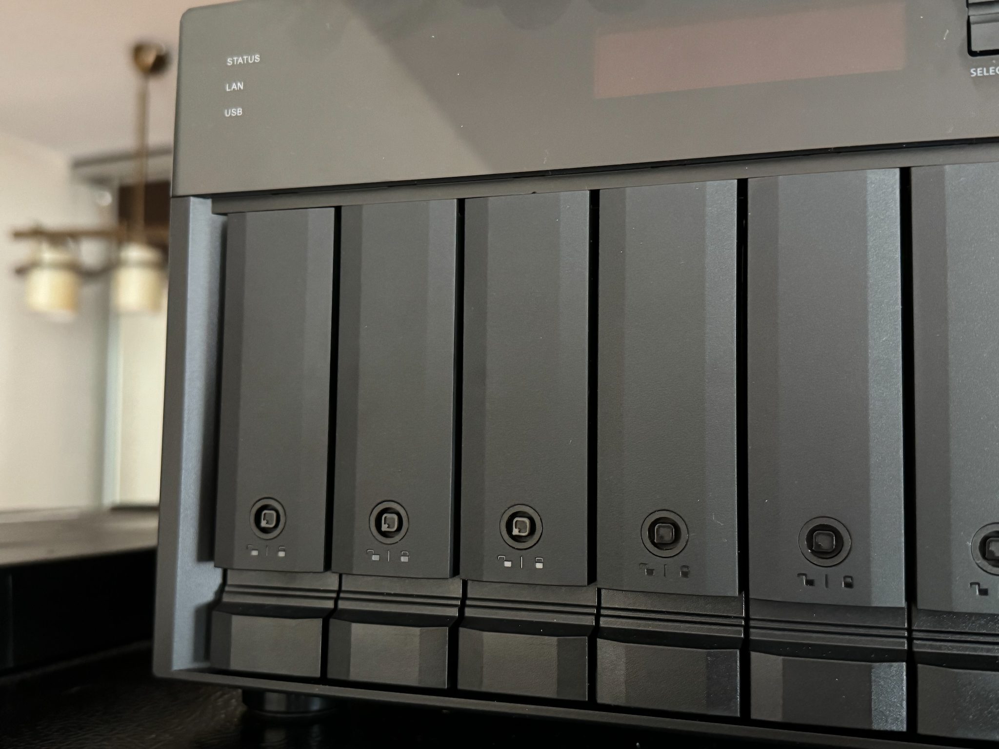 Pe partea din față vei mai găsi poate diferit de NAS-urile mai mici un afișaj digital monocromatic care îți poate furniza rapid niște informații privind poate conexiunea activă, adresa IP, și câteva setări ce pot fi făcute utilizând butoanele din dreapta afișajului.