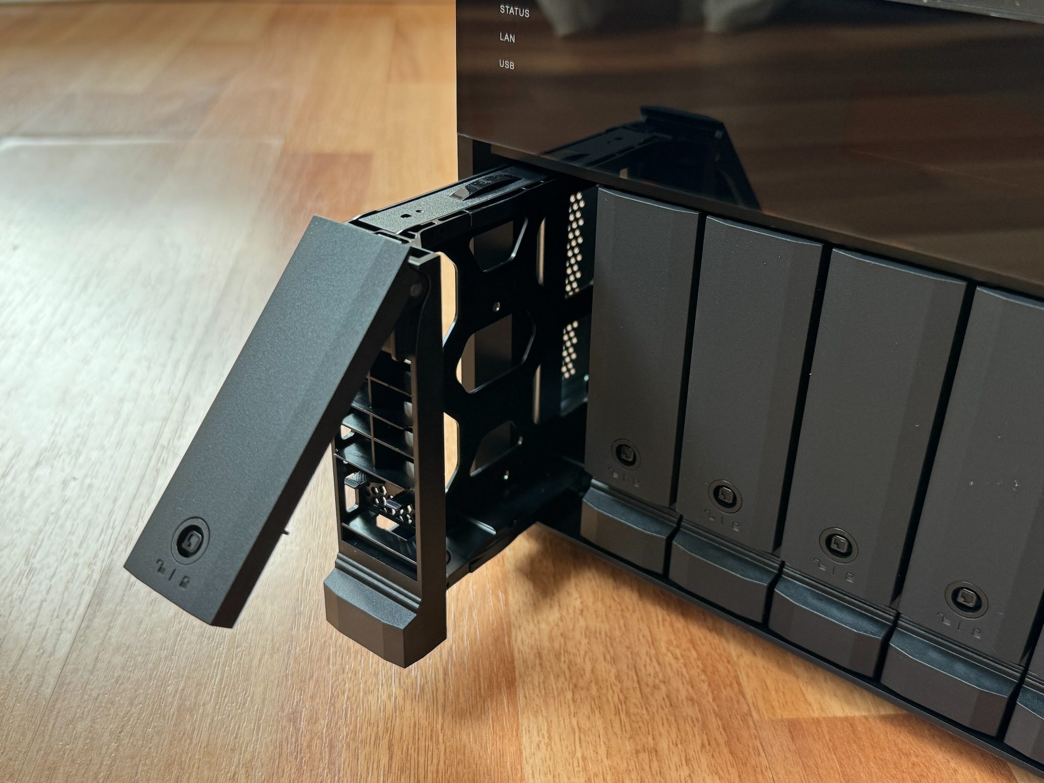 Apoi tot ce mai trebuie să faci este doar să împingi sertarul până la capăt și după ce ai ajuns la capăt să apeși clapeta. În cutia cu care vine NAS-ul ai și niște chei cu care poți bloca clapetele, să nu fugă cineva cu datele tale (mai în glumă mai în serios).