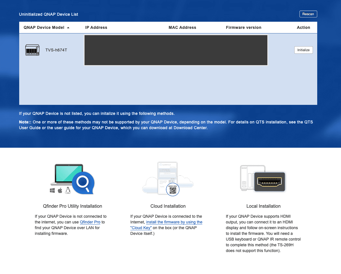 Pentru a configura NAS-ul m-am uitat puțin în ghid apoi am vazut o etichetă sugestivă lipită de carcasă. Sugera că pentru accesare să scanez codul QR și așa am făcut. A trebuit doar să fie NAS-ul conectat la router astfel încât să aibă acces Internet, apoi în serviciul web de la QNAP acesta a fost identificat și am început crearea unui cont și procesul de configurare care nu a fost deloc greu. Am ascuns MAC-ul în imagine și alte informații sensibile.
