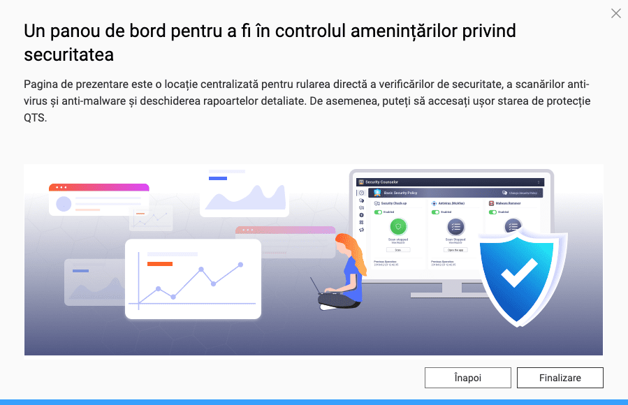 Aplicația pentru protecția datelor și împotriva atacurilor cibernetice numită Security Counselor a fost iarăși un tool pe care l-am apreciat pentru că îmi fac griji pentru siguranța datelor. Adică daca ai legat acest sistem la internet, și tu ai multe date pe care vrei să le și protejezi trebuie să te gândești și cum să securizezi mai bine sistemul și aplicația aceasta în primul rând are profile predefinite cu diferite niveluri de securitate și poți vedea și ce funcții de protecție sunt activate astfel încât să ai o imagine cât mai clară asupra NAS-ului tău.
