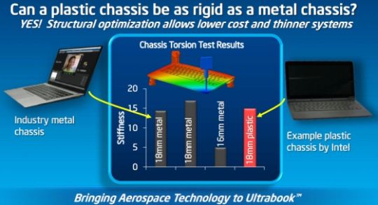 Intel lucreaza la noi modalitati de a modifica structura plasticului pentru a permite producatorilor de PC-uri sa creeze laptop-uri cu carcase subtiri din plastic, care sa fie la fel de rezistente ca cele din metal. Dar carcasele din metal nu doar ca sunt mai rigide decat cele din plastic, ci si arata si mai bine. Intel vinde ultrabook-urile ca pe un produs premium, desigur ca nu vreti ca acesta sa arate ca un model cumparat la mana a doua, nu-i asa ?