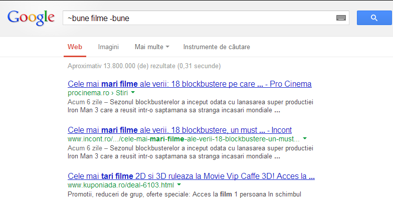 Folosiți semnul „~” pentru a căuta termeni asemănători. De exemplu, ca urmare a expresiei: „~ bune filme – bune”, veți vedea toate link-uri către pagini care conțin sinonime ale cuvântului „cel mai bun”, dar nici unul dintre ei va conține cuvântul.