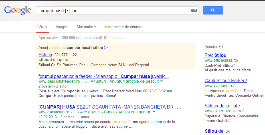 De exemplu, vom introduce expresia „cumpăr husă| stilou” ne va oferi o pagină care conține fie „cumper husă” sau „cumper stilou”
