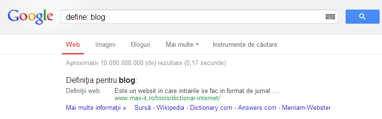 Pentru a afla definitia unui cuvânt, trebuie doar să introduceți comanda „define:” urmat de fraza de căutare. (Pentru Romania nu functioneaza prea bine, nu am gasit definitii dacat la o parte din cuvintele cautate de mine)