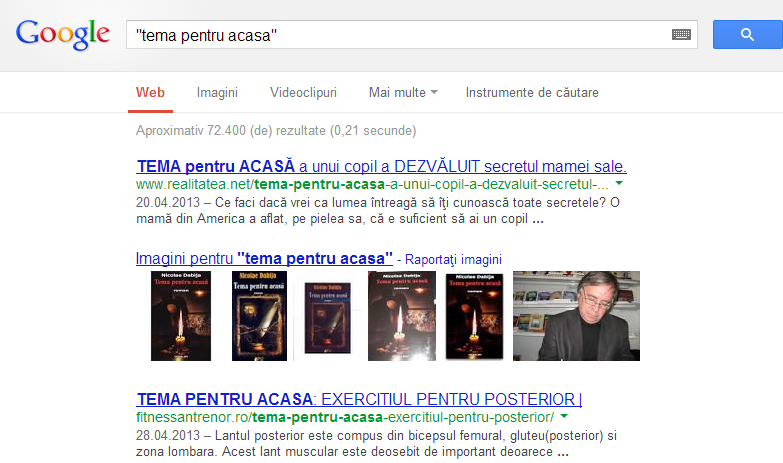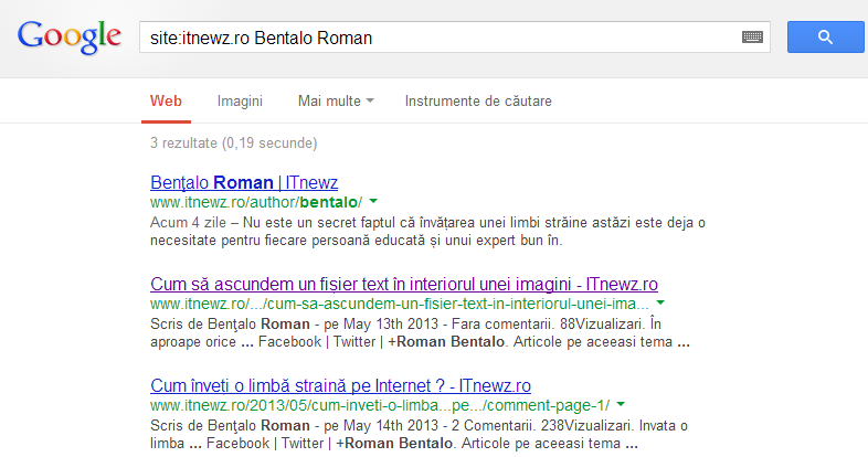 Pentru a căuta ceva doar de pe un singur site trebuie folosita urmatoarea comanda: „site:http://siteulcautat.ro cuvinte_cheie”.