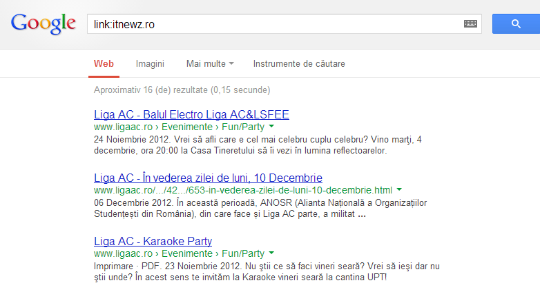 Pentru a găsi toate backlink-urile (indexate de Google) ce duc la site-ul care vă interesează e necesar să scrieți înainte de site ”link:”