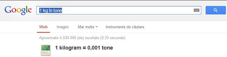 Motorul de căutare Google este de asemenea capabil de a converti unități de măsură chiar si valută (vezi mai jos) la cererea utilizatorului. De exemplu, dacă trebuie să convertiți un kg în tone. Atunci scriem următoarea interogare: „1 kg în tone” (dar desigur voi știți cât înseamnă în tone un kilogram).