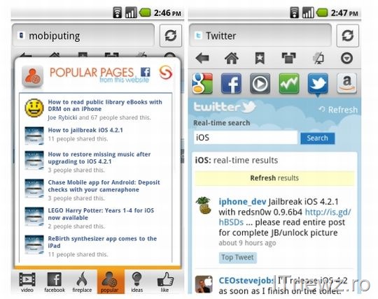 Skyfire se lauda ca ofera suporta pentru Adobe Flash pe platforme care de altfel nu l-ar suporta, si aici ma refer la versiunea 2.1 a sistemului de operare Google Android si la versiuni mai vechi ale acestuia. Skyfire ofera deasemenea si acces la retelele de socializare precum Facebook prin intermediul aplicatiilor dedicate integrate in browser.![]()